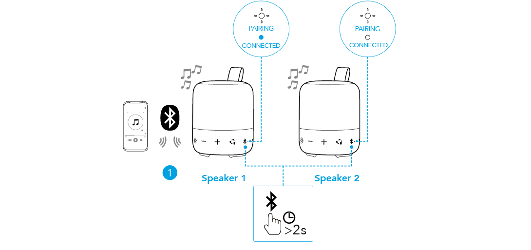 Po podłączeniu jednego głośnika do smartfona, należy przez 2 sekundy nacisnąć i przytrzymać przycisk Bluetooth na dwóch głośnikach, aby wejść w tryb łączenia TWS.