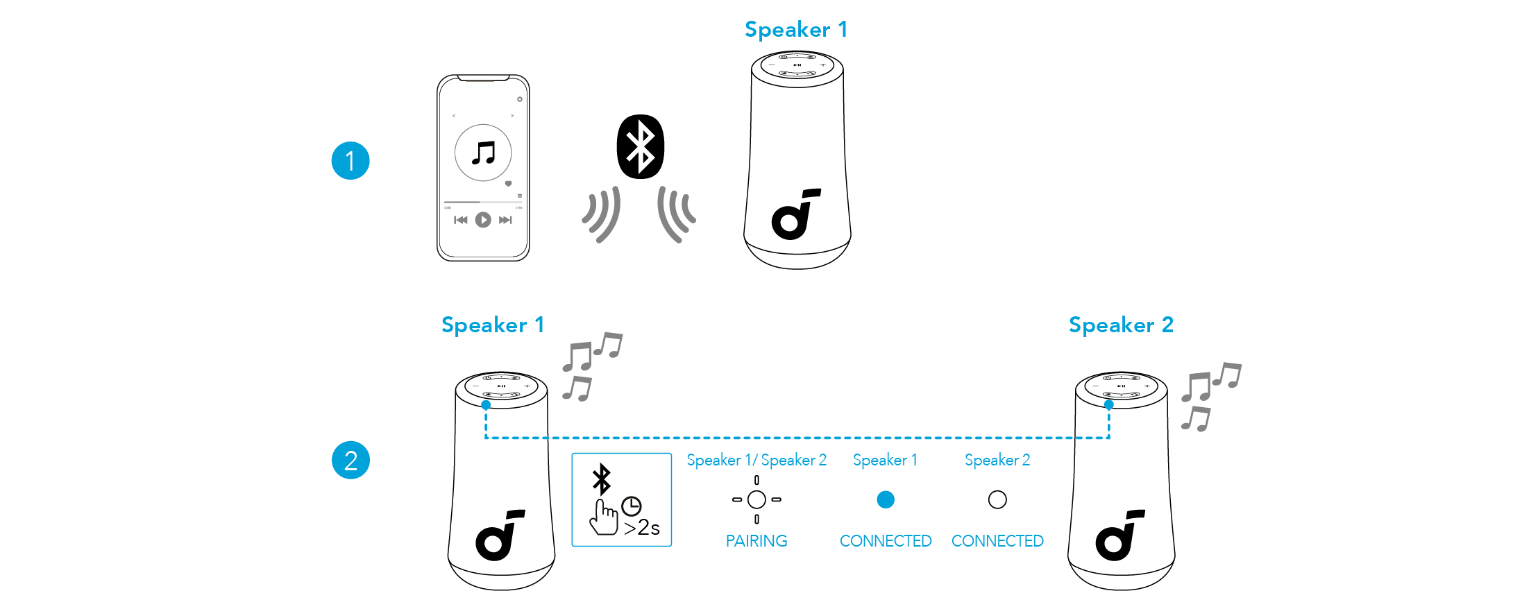 Dwa identyczne głośniki soundcore mogą się ze sobą połączyć w celu uzyskania dźwięku stereo. Oba głośniki mogą odtwarzać ten sam materiał audio (jeden jako kanał lewy, a drugi jako kanał prawy).