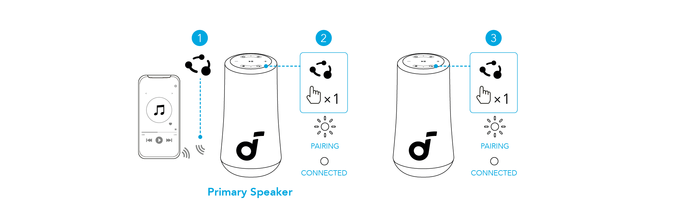 Po podłączeniu jednego głośnika do smartfona, naciśnij przycisk PartyCast na maksymalnie 100 głośnikach soundcore z funkcją PartyCast, aby zsynchronizować dźwięk i światło.