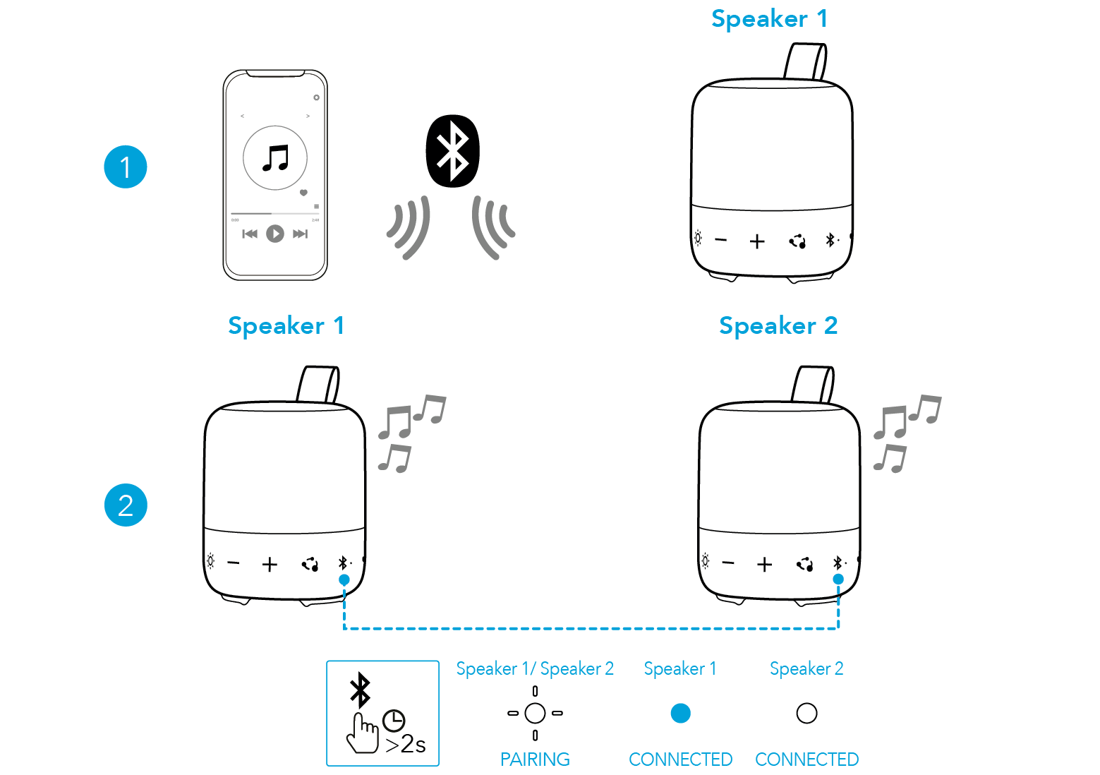 Po podłączeniu jednego głośnika do smartfona, należy przez 2 sekundy nacisnąć i przytrzymać przycisk Bluetooth na dwóch głośnikach, aby wejść w tryb łączenia TWS.