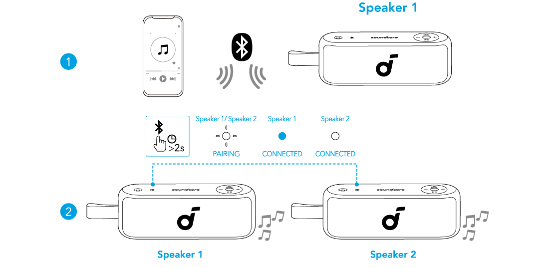 Подключите один динамик к смартфону, затем удерживайте кнопку Bluetooth на двух динамиках в течение 2 секунд, чтобы войти в режим сопряжения TWS.