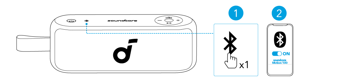 Нажмите кнопку Bluetooth, чтобы войти в режим сопряжения Bluetooth, затем выберите "soundcore Motion 100" из списка Bluetooth для подключения.