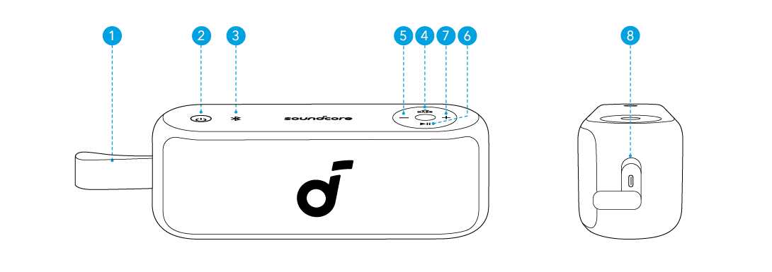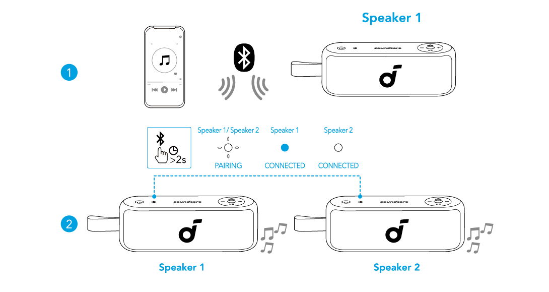 两个相同的soundcore音箱可以配对,以获得立体声声音。 两个音箱可以播放同一音频(一个作为左声道,另一个作为右声道)。