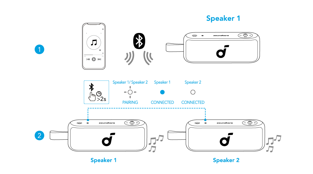 يمكن لسماعتين منsoundcore المتطابقتين الاتصال ببعضهما البعض للحصول على صوت ستيريو. يمكن لكلا السماعتين تشغيل نفس الصوت (إحداهما كقناة يمنى والأخرى كقناة يسرى).