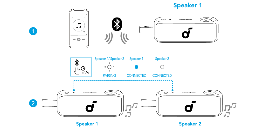 Två identiska soundcore-högtalare kan para ihop med varandra för stereoljud. Då spelar varje högtalare upp en av ljudkanalerna (den ena spelar upp ljudet i vänster kanal och den andra spelar upp ljudet i höger kanal).