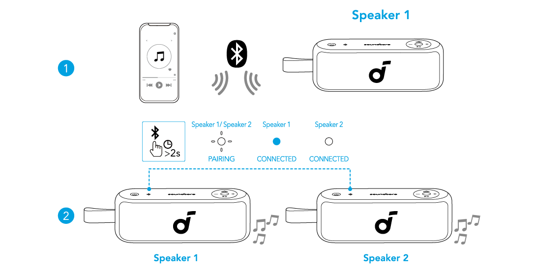 Wenn ein Lautsprecher bereits mit einem Smartphone verbunden ist, drücken und halten Sie die Bluetooth-Taste an beiden Lautsprechern für 2 Sekunden, um in den TWS-Kopplungsmodus zu wechseln.