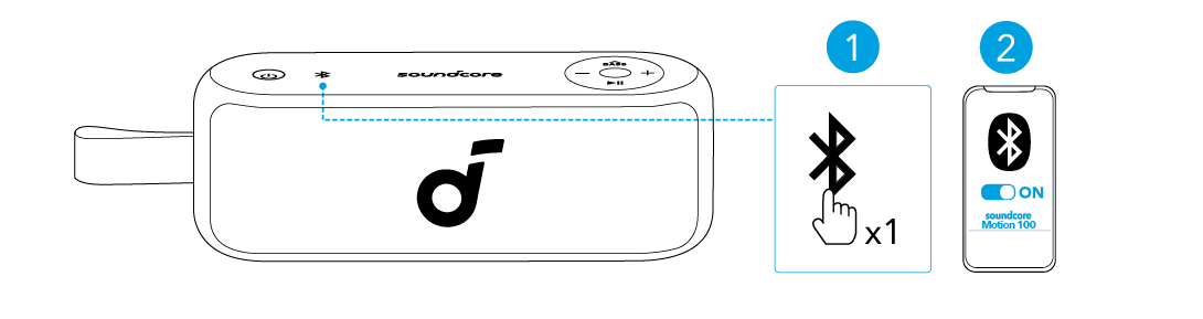 Drücken Sie die Bluetooth-Taste, um in den Bluetooth-Kopplungsmodus zu gelangen, wählen Sie dann "soundcore Motion 100" aus der Bluetooth-Liste aus, um eine Verbindung herzustellen.