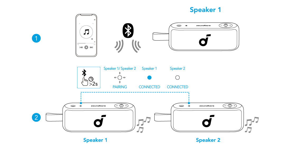 To identiske soundcore-højttalere kan parres med hinanden for stereolyd. Begge højttalere kan afspille den samme lyd (én som venstre kanal og den anden som højre kanal).