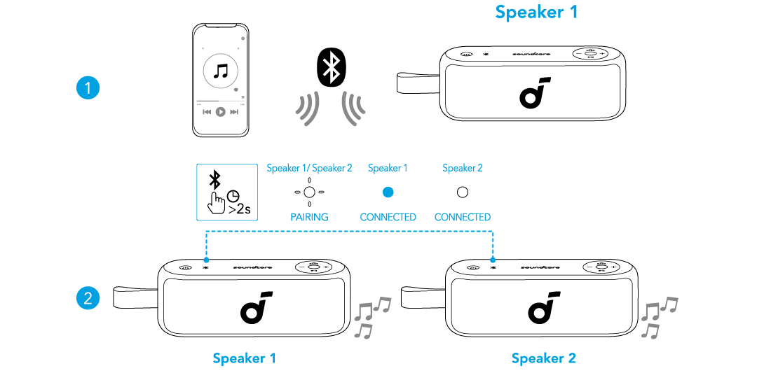 Med én høyttaler tilkoblet en smarttelefon, trykk og hold Bluetooth-knappen i 2 sekunder på to høyttalere for å gå inn i TWS-parringmodus.