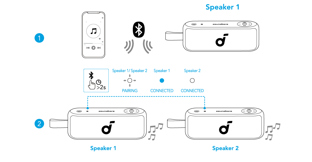 Dois alto-falantes soundcore idênticos podem ser conectados um ao outro para som estéreo. As duas caixas podem tocar o mesmo áudio (uma como canal esquerdo e a outra como canal direito).