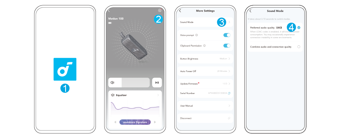 No aplicativo soundcore, toque no ícone Configurações > "Modo de som" > "Qualidade de áudio preferida".