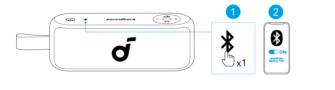 Pressione o botão Bluetooth para entrar no modo de emparelhamento Bluetooth e, em seguida, selecione "soundcore Motion 100" na lista Bluetooth para conectar.