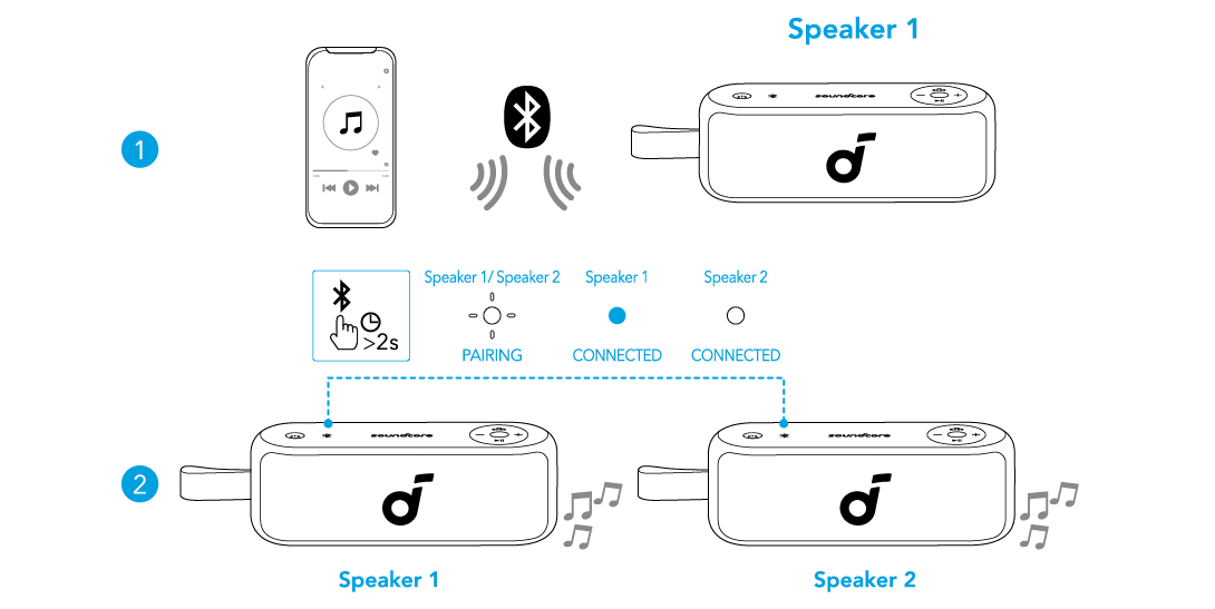 Due altoparlanti soundcore identici possono essere accoppiati tra loro per un suono stereo. Entrambi gli altoparlanti sono in grado di riprodurre lo stesso audio (uno come canale sinistro, l'altro come canale destro).