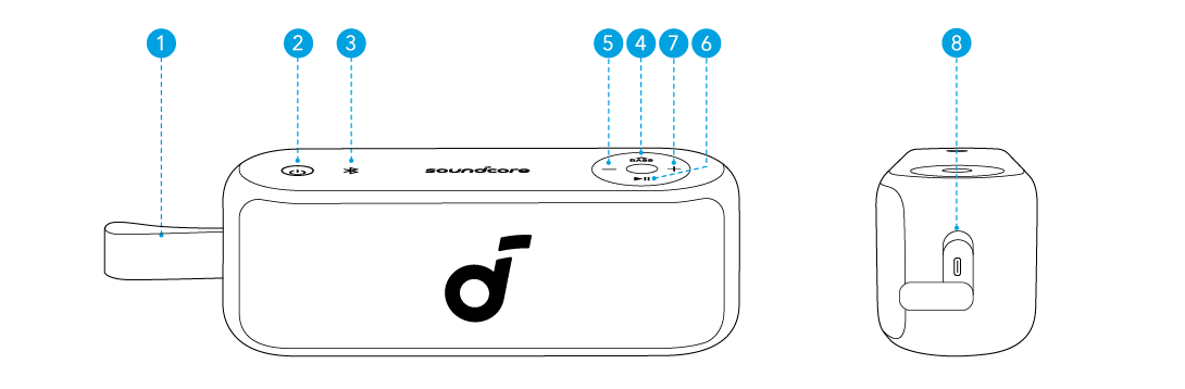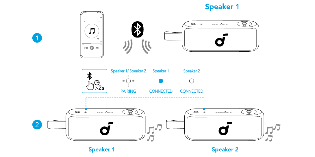 Deux haut-parleurs soundcore identiques peuvent être associés pour un son stéréo. Les deux enceintes peuvent diffuser le même son (l’une comme canal gauche et l’autre comme canal droit).