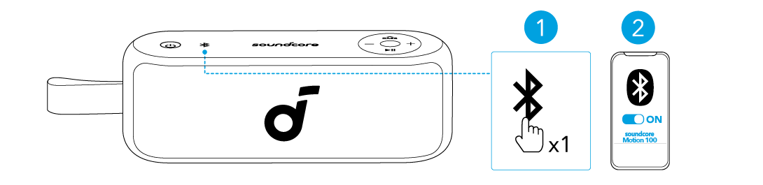 Appuyez sur le bouton Bluetooth pour entrer en mode de jumelage Bluetooth, puis sélectionnez "soundcore Motion 100" dans la liste Bluetooth pour vous connecter.
