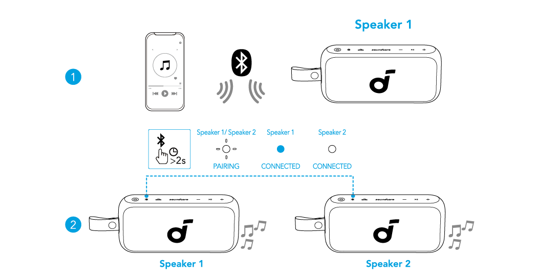 將一個揚聲器連接到智慧型手機後,在兩個揚聲器上按住藍牙按鈕2秒鐘進入TWS配對模式。