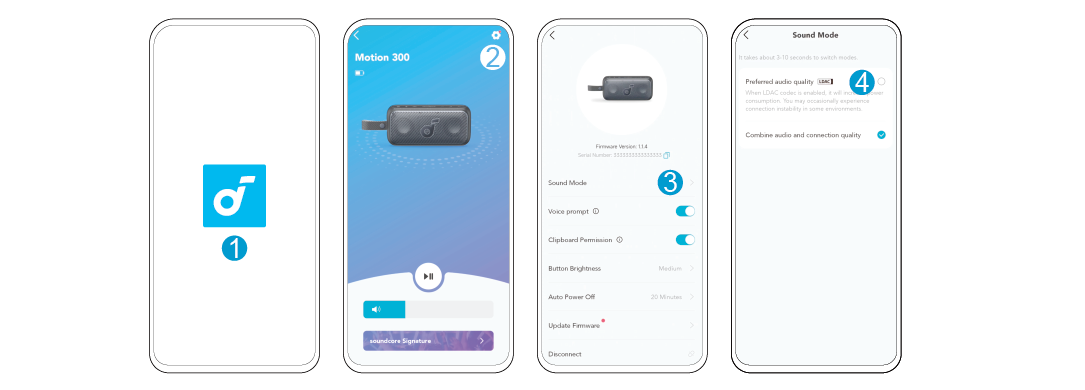 在soundcore應用程式中,點擊「設定」圖示 > 「聲音模式」 > 「首選音訊品質」。