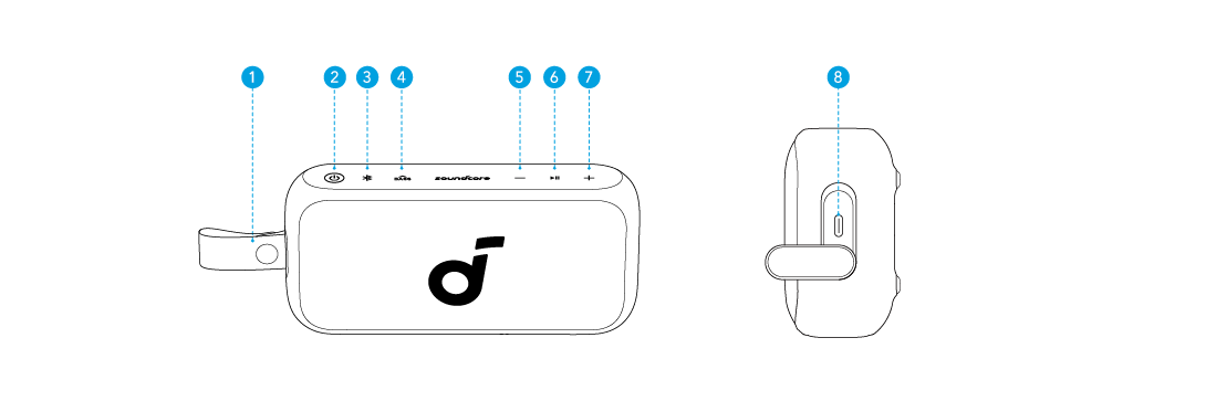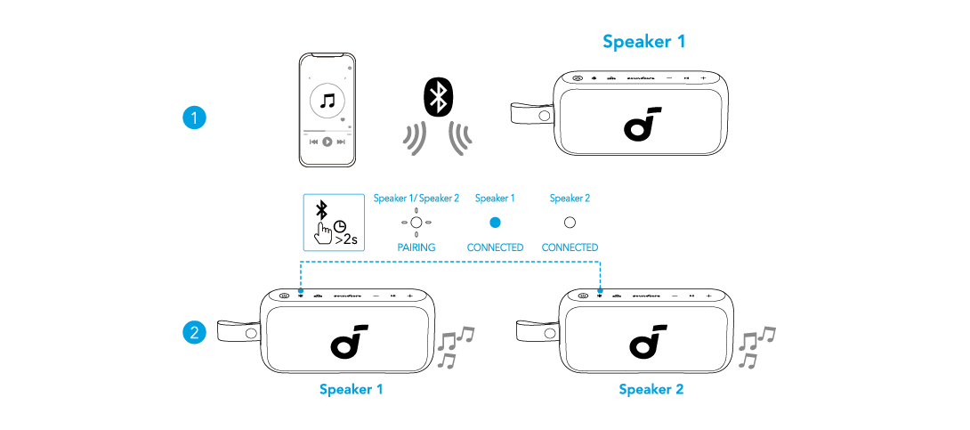 To identiske soundcore-højttalere kan parres med hinanden for stereolyd. Begge højttalere kan afspille den samme lyd (én som venstre kanal og den anden som højre kanal).
