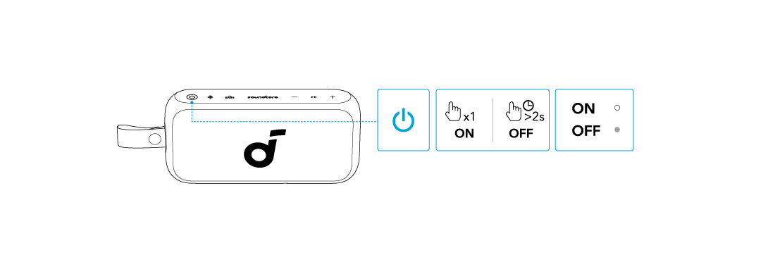 - Hver gang du tænder for din højttaler, vil den automatisk oprette forbindelse til din senest tilsluttede enhed, hvis den er inden for Bluetooth-dækningsområdet. Hvis ikke, tryk på Bluetooth-knappen for at gå til Bluetooth-parringstilstand.