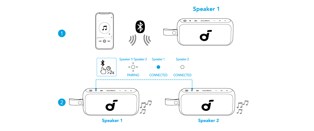 Med én høyttaler tilkoblet en smarttelefon, trykk og hold Bluetooth-knappen i 2 sekunder på to høyttalere for å gå inn i TWS-parringmodus.