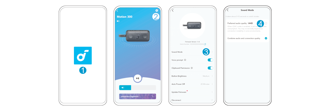 I soundcore-appen, trykk på Innstillinger-ikonet > "Lydmodus" > "Foretrukket lydkvalitet".