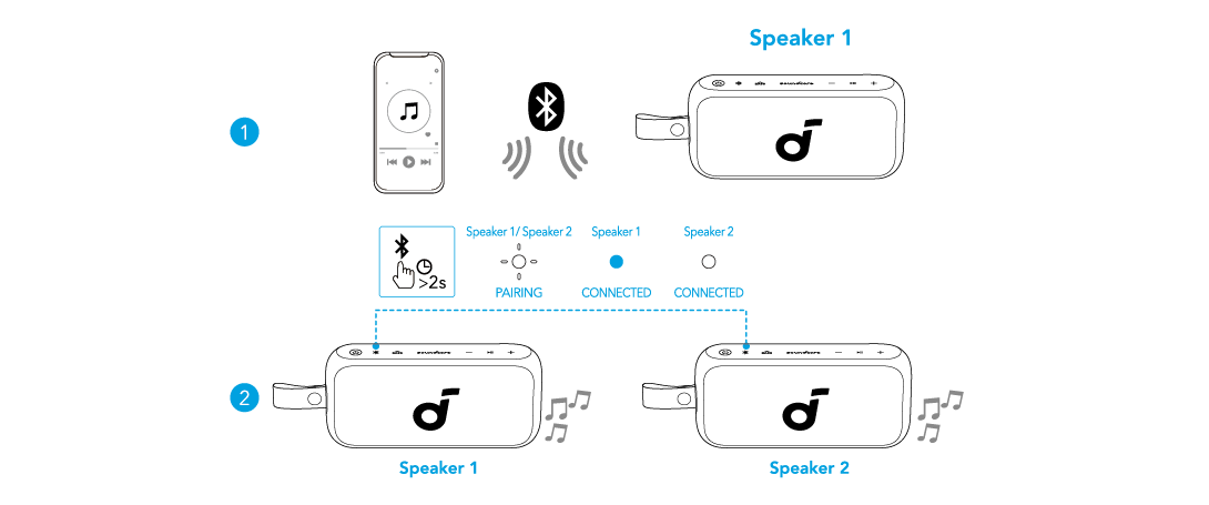 Due altoparlanti soundcore identici possono essere accoppiati tra loro per un suono stereo. Entrambi gli altoparlanti sono in grado di riprodurre lo stesso audio (uno come canale sinistro, l'altro come canale destro).