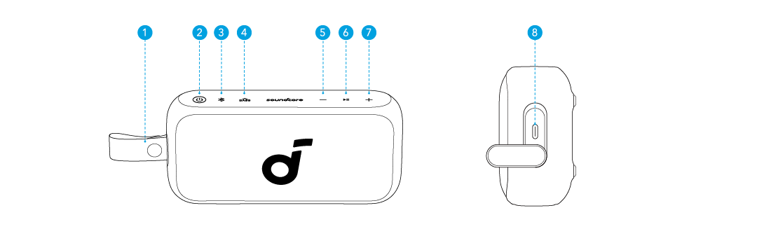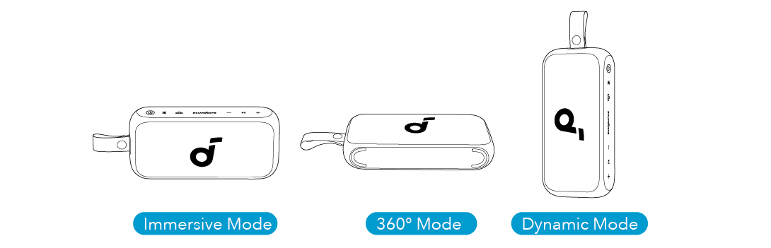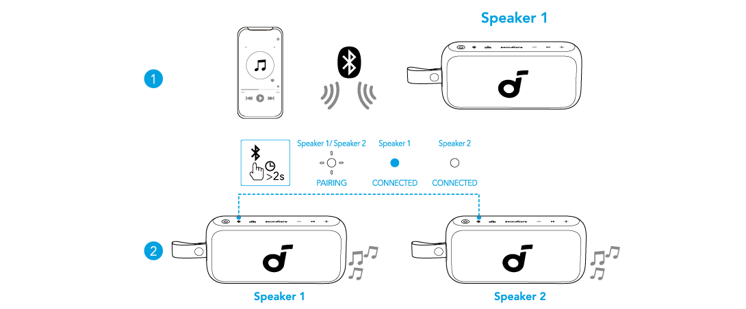 Kaksi identtistä soundcore-kaiutinta voidaan yhdistää toisiinsa stereokaiuttimen muodostamiseksi. Molemmat kaiuttimet voivat toistaa samaa ääntä (yksi vasenta kanavaa ja toinen oikeaa kanavaa).