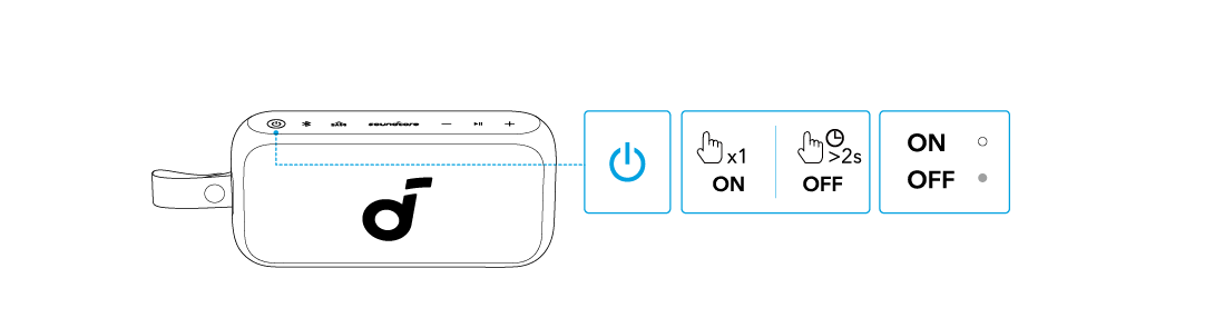 - Kun kytket virran kaiuttimeen, se muodostaa yhteyden viimeksi yhdistettyyn laitteeseesi, mikäli kyseinen laite on käytettävissä Bluetooth-kantaman alueella. Jos ei ole, siirry Bluetooth-parinmuodostustilaan painamalla Bluetooth-painiketta.