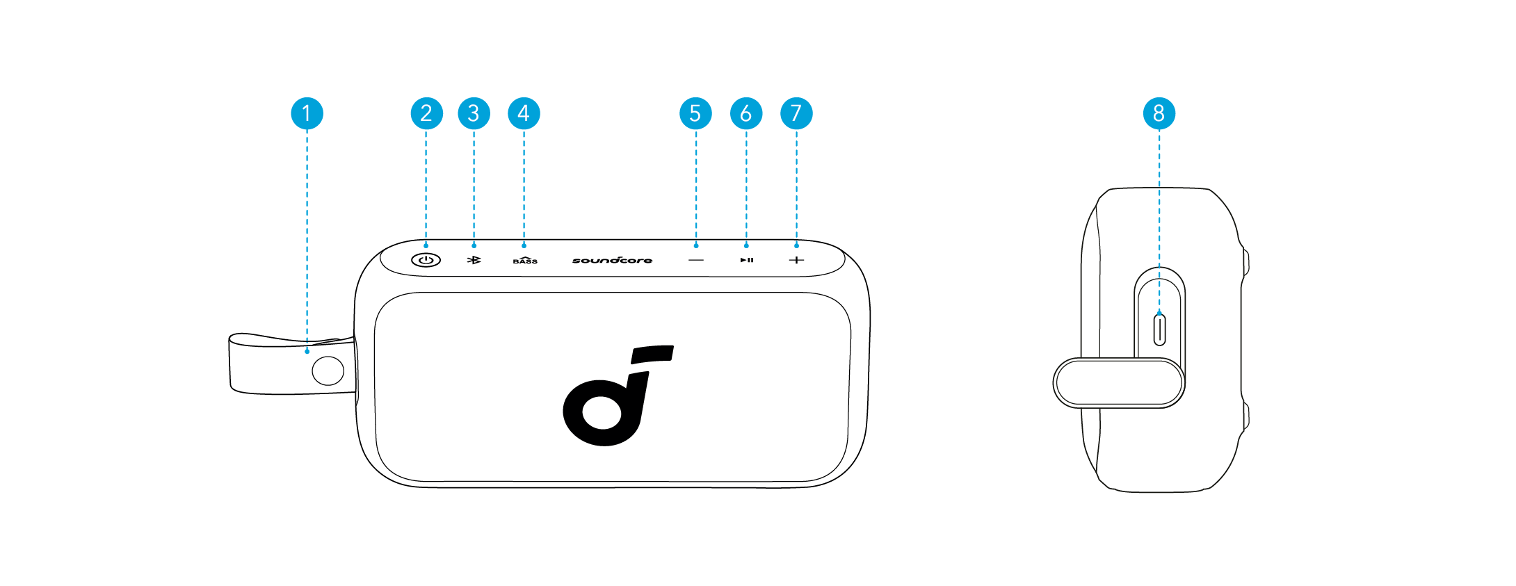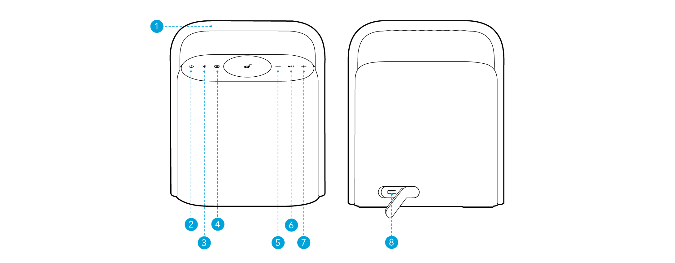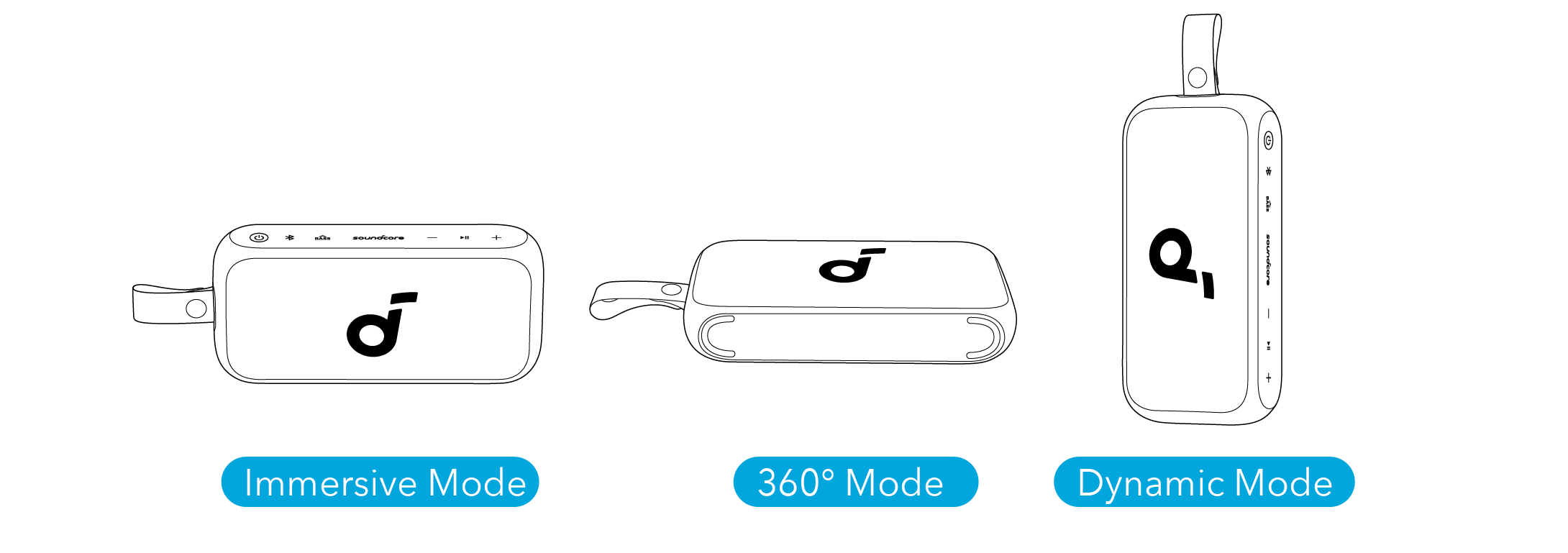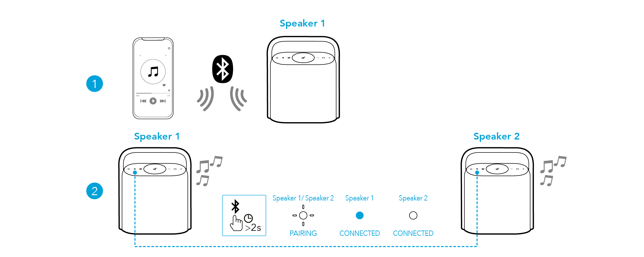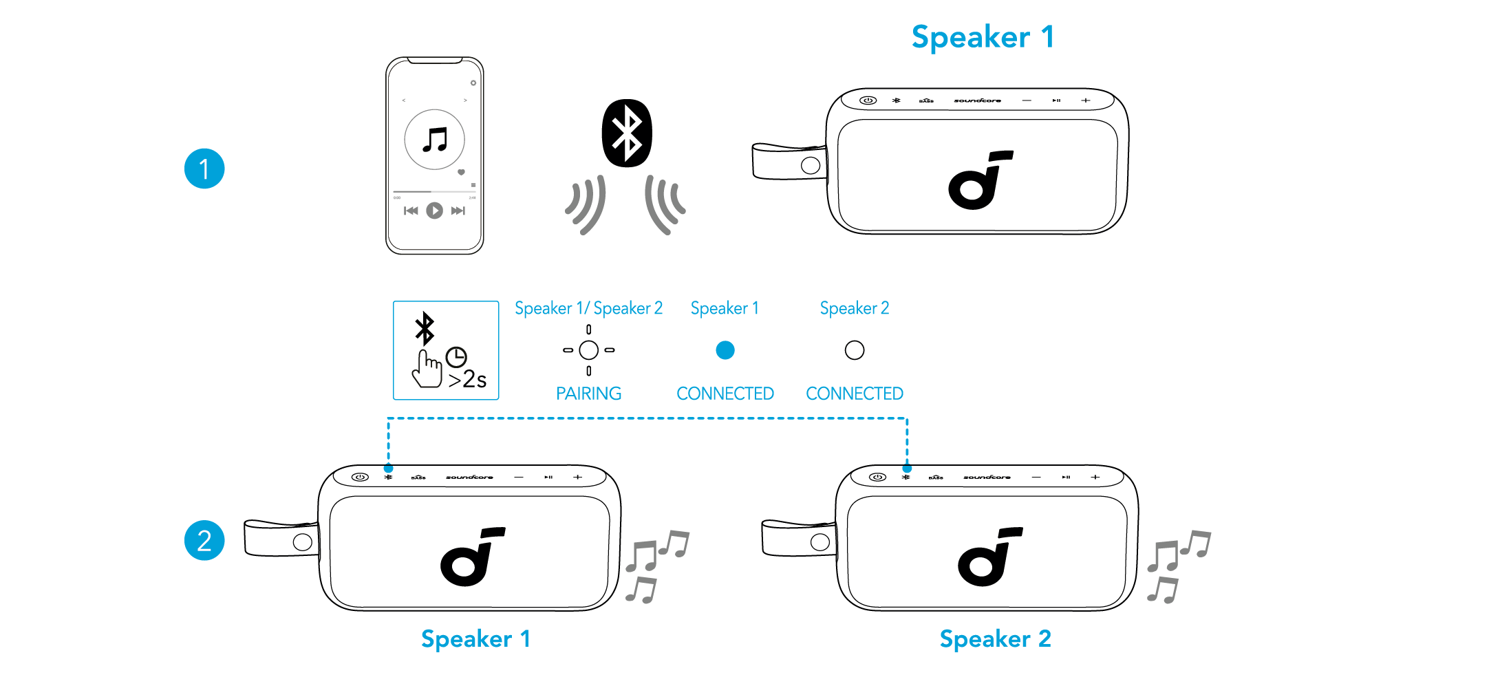 Dva identické reproduktory soundcore mohou být propojeny pro stereo zvuk. Oba reproduktory mohou přehrávat stejný zvukový obsah (jeden jako levý kanál a druhý jako pravý).