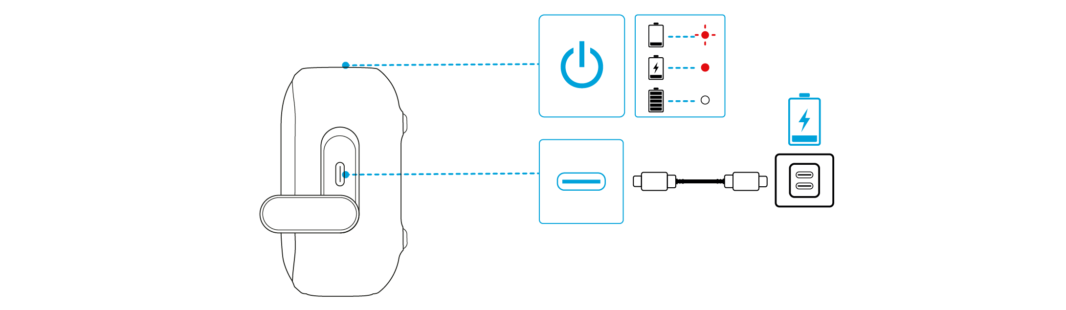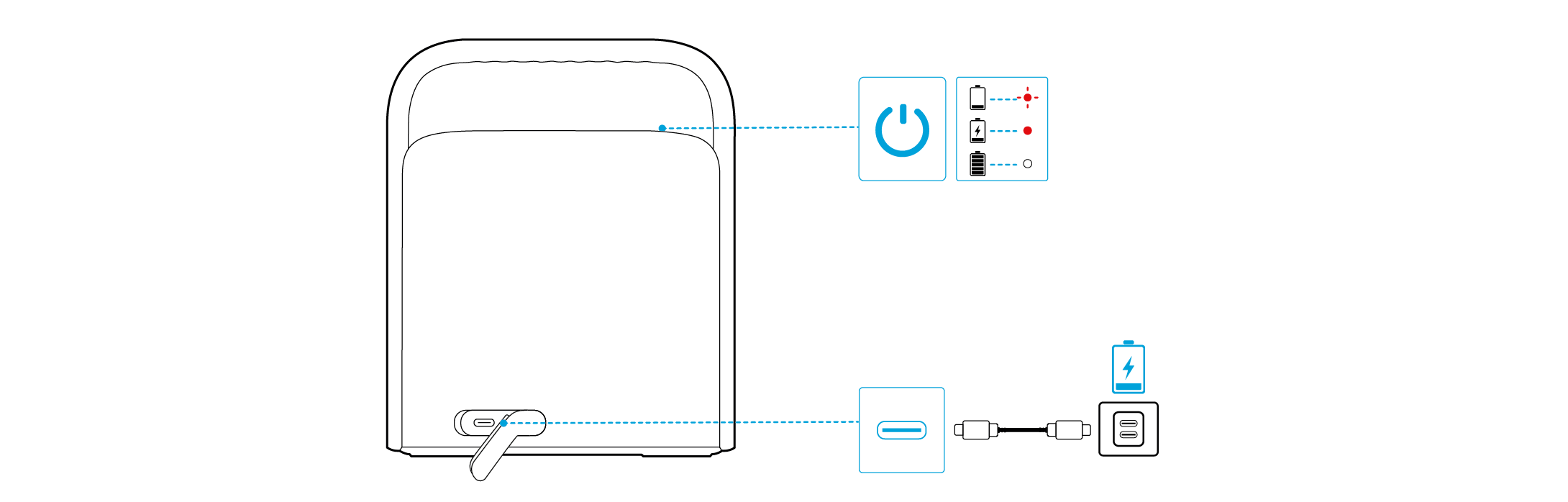 Nabíjení vašeho reproduktoru Použijte pouze certifikovaný nabíjecí kabel USB-C a nabíječku, abyste zabránili poškození.