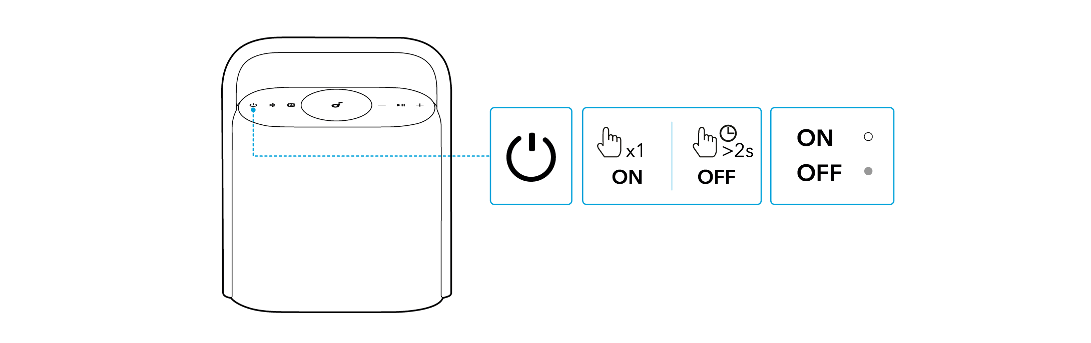 - Pokaždé, když reproduktor zapnete, automaticky se připojí k naposledy připojenému zařízení, pokud je v dosahu modulu Bluetooth. Stisknutím tlačítka Bluetooth vstoupíte do režimu párování Bluetooth.