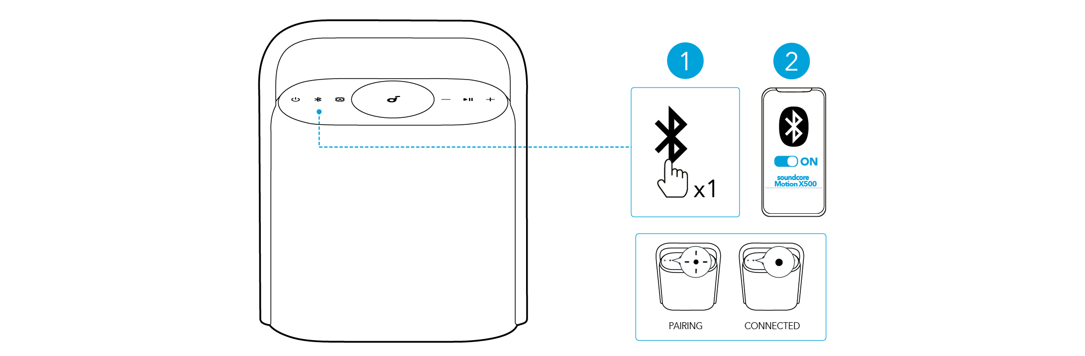 Stiskněte tlačítko Bluetooth pro vstup do párovacího režimu Bluetooth, poté vyberte "soundcore Motion X500" z Bluetooth seznamu pro připojení.