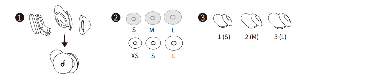 Probiere unterschiedliche Größen von Ohrstöpseln und Ohrflügeln aus, um die beste Passform und einen dichten Sitz zu finden. Falls ein Ohrstöpsel nicht gut sitzt, teste bitte verschiedene Größen für jedes Ohr, z. B. mittelgroß in einem Ohr und groß im anderen.