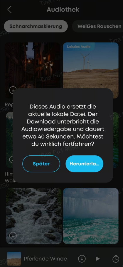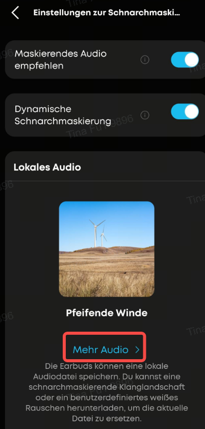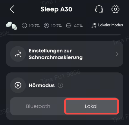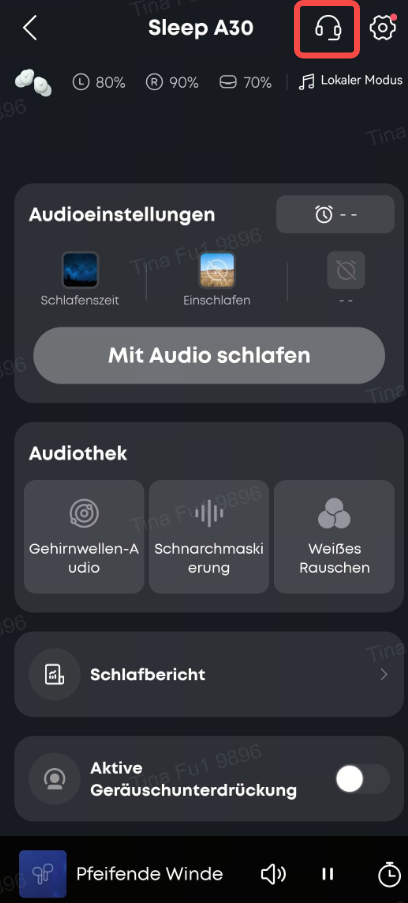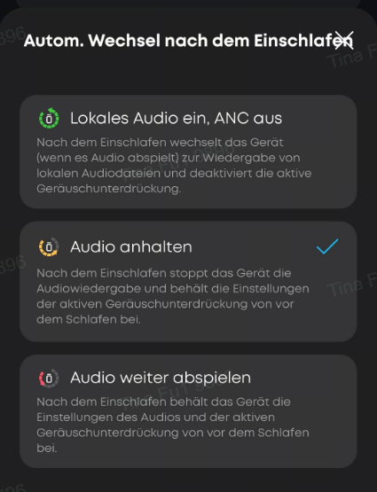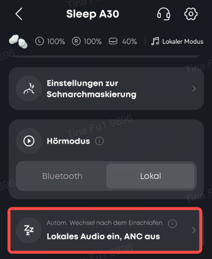 Sobald die Kopfhörer erkennen, dass du eingeschlafen bist und automatisch in den lokalen Modus wechseln, wird beim Abspielen von integrierten Audio-Dateien (zum Beispiel zum Überdecken von Schnarchgeräuschen) die ANC-Funktion automatisch deaktiviert.