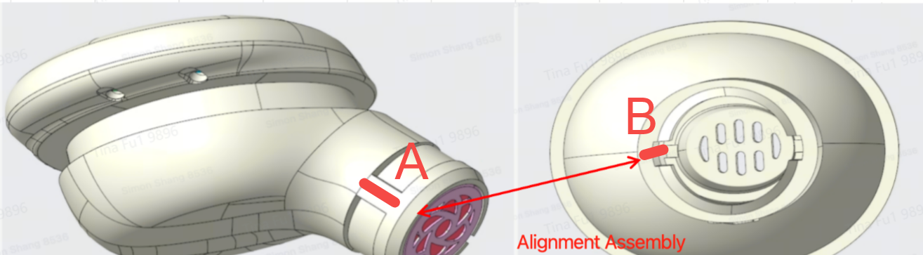Beim Wechseln der Ohrstöpsel muss darauf geachtet werden, dass die Entlüftungsöffnung der Ohrstöpsel (B) mit der Entlüftungsöffnung am unteren Gehäuse des Kopfhörers (A) ausgerichtet ist. Andernfalls kann die ANC-Wirkung beeinträchtigt werden (siehe Abbildung).